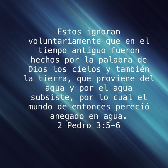 • 📖 2 Pedro 3:5-6. “Porque ellos ignoran voluntariamente esto; que por la palabra de Dios fueron creados los cielos en el tiempo antiguo, y la tierra, que por agua y en agua está asentada; por lo cual el mundo de entonces pereció anegado en agua.