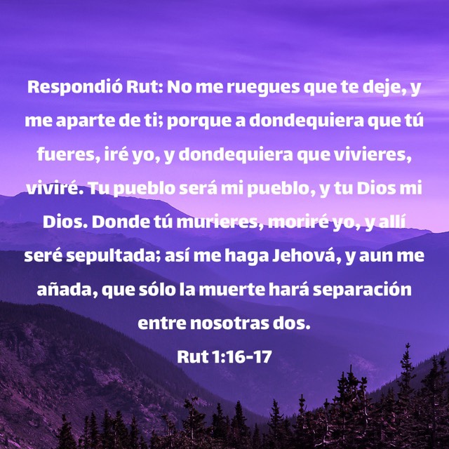 📖 Respondió Rut: No me ruegues que te deje, y me aparte de ti; porque a dondequiera que tú fueres, iré yo, y dondequiera que vivieres, viviré. Tu pueblo será mi pueblo, y tu Dios mi Dios. Donde tú murieres, moriré yo, y allí seré sepultada; así me haga Jehová, y aun me añada, que sólo la muerte hará separación entre nosotras dos [v. 16-17]
