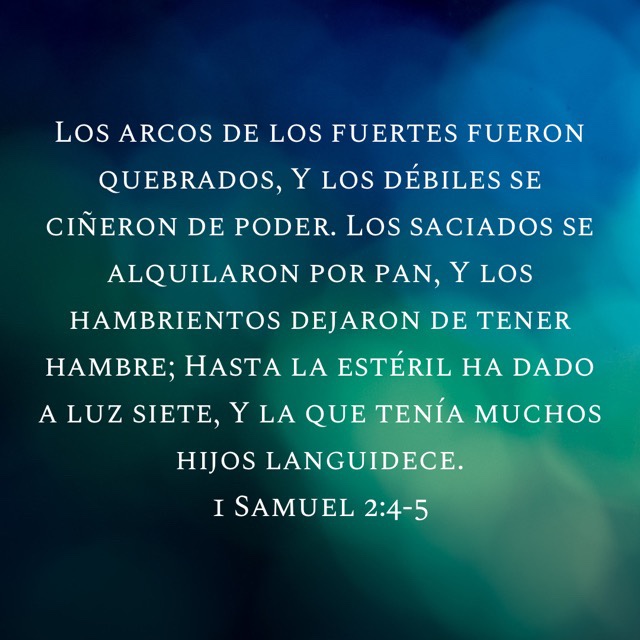 • Los saciados se alquilaron por pan, Y los hambrientos dejaron de tener hambre; Hasta la estéril ha dado a luz siete, Y la que tenía muchos hijos languidece.